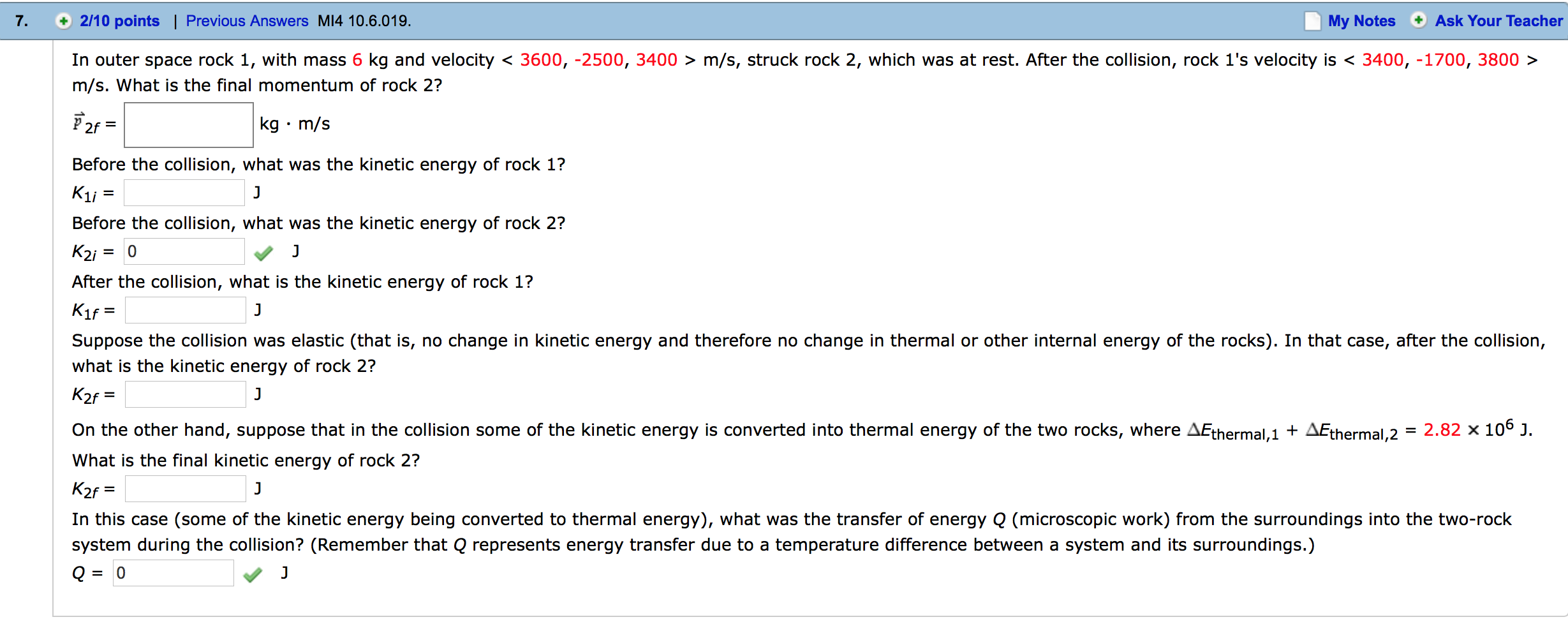 What is the final kinetic energy of rock 2? K2f = J In this case (some of the kinetic energy being converted to thermal energy), what was the transfer of energy Q (microscopic work) from the surroundings into the two-rock