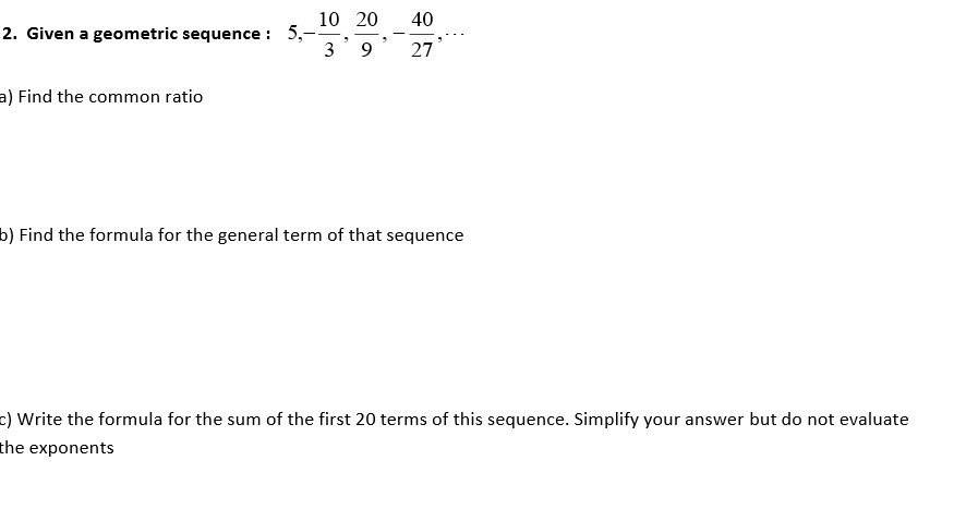 10 20 40 2. Given a geometric sequence: 5,——, — , — —, - - - 3) Find the common ratio b) Find the formula for the general term of that sequence :) Write the formula for the sum of the first 20 terms of this sequence. Simplify your answer but do not evaluate the exponentsÂ