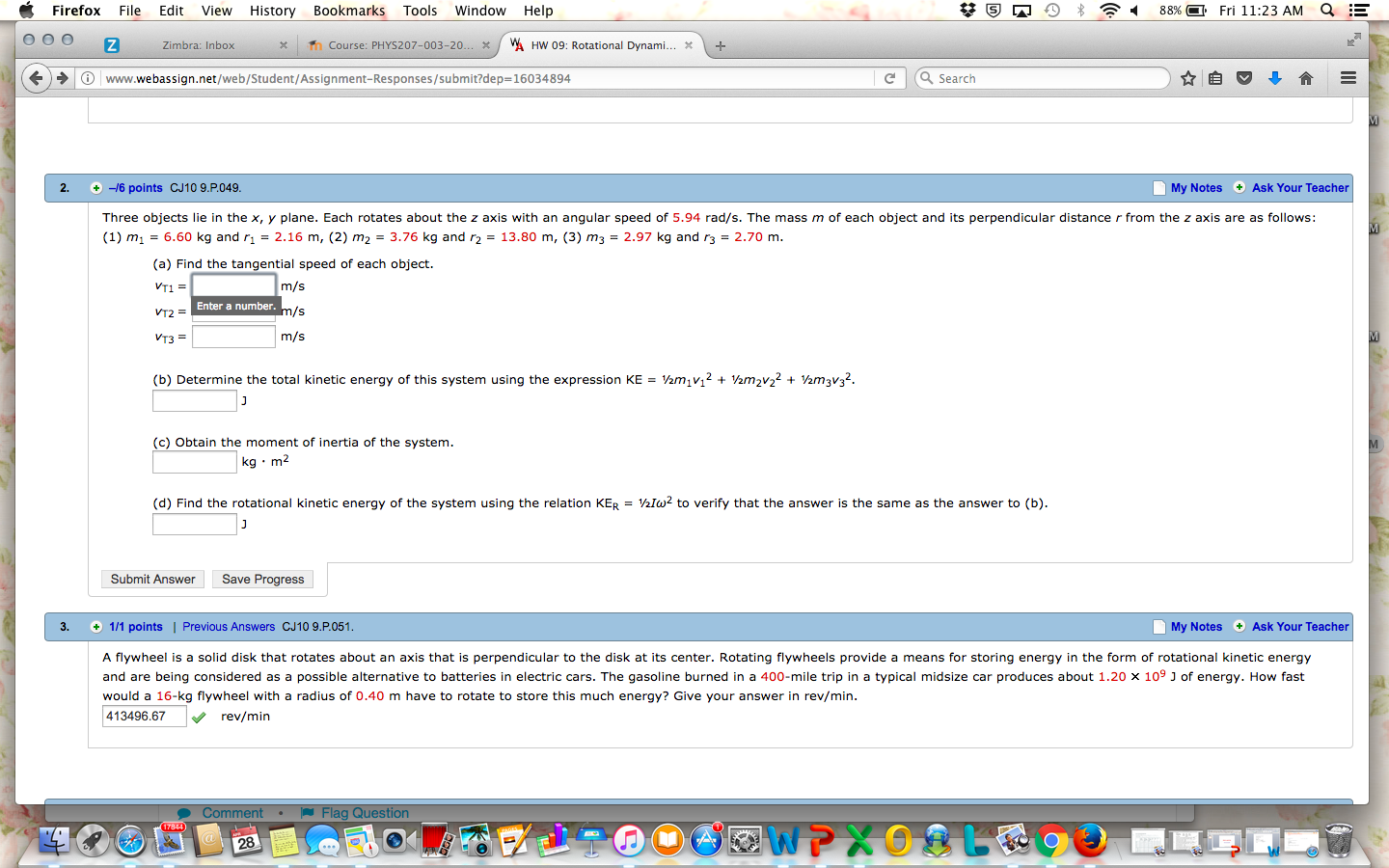 ‘ Firefnx Fils Edit View History Bookmarks Tools Window Help _ :- fi 15 m {9 3B 2'?- 1 SEKI- Fri11:23 AM Q‘iE “'5 "was: Rotational Dynlml... x .0 I)‘ G) Iww.webasslgn.nerlwebeludent/Assignmenr-Responses}subml17dep=16034394 Three objects lie in the x, y plane. Each rotates about the z axis with an angular speed of 5.94 radls. The mass m of each object and Its perpendicular distance r from the z axis are as Follows: