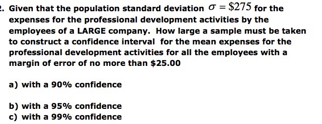 :. Given that the population standard deviation 0' = $275 for the expenses for the professional development activities by the employees of a LARGE company. How large a sample must be taken to construct a confidence interval for the mean expenses for the professional development activities for all the employees with a margin of error of no more than $25.00 a) with a 90% confidence b) with a 95% confidence c) with a 99% confidenceÂ