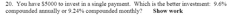 20. You have $5000 to invest in a single payment. Which is the better investment: 9.6% compounded annually or 9.24% compounded monthly? Show workÂ