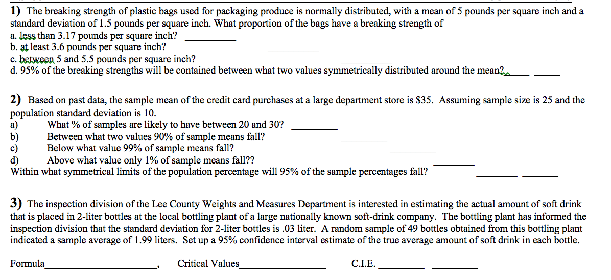 standard deviation of 1.5 pounds per square inch. What proportion of the bags have a breaking strength of a. lessthan 3.17 pounds per square inch? b. atleast 3.6 pounds per square inch? c. between 5 and 5.5 pounds per square inch? d. 95% of the breaking strengths will be contained between what two values symmetrically distributed around the mean1A_ 2) Based on past data, the sample mean of the credit card purchases at a large department store is $35. Assuming sample size is 25 and the