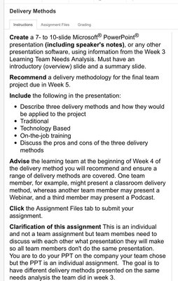 Create a 7 slides Microsoft® PowerPoint®presentation (including speaker's notes), or any other presentation software, using information from the Week 3 Learning Team Needs Analysis. Must have an introductory (overview) slide and a summary slide.