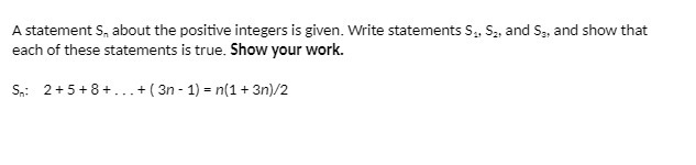 A statement Sn about the positive integers is given. Write statements Si, 52, and S3, and show that each of these statements is true. Show your work. Sn: 2+5+8+...+(3n-1)=n(1+3n)/2Â