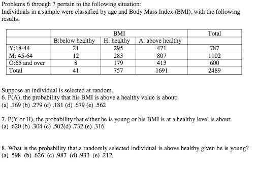 Problems 6 through 7 pertain to the following situation: Individuals in a sample were classified by age and Body Mass Index (BMI), with the following results. BMI Total B:below healthy H: healthy A: above healthy Y:18-44 21 295 471 787 M: 45-64 12 283 807 1102 0:65 and over 8 179 413 600 Total 41 757 1691 2489 Suppose an individual is selected at random. 6. P(A), the probability that his BMI is above a healthy value is about: (a) .169 (b) .279 (c) .181 (d) .679 (e) .562 7. P(Y or H), the probability that either he is young or his BMI is at a healthy level is about: (a) .620 (b) .304 (c) .502(d) .732 (e) .316 8. What is the probability that a randomly selected individual is above healthy given he is young? (a) .598 (b) .626 (c) .987 (d) .933 (e) .212