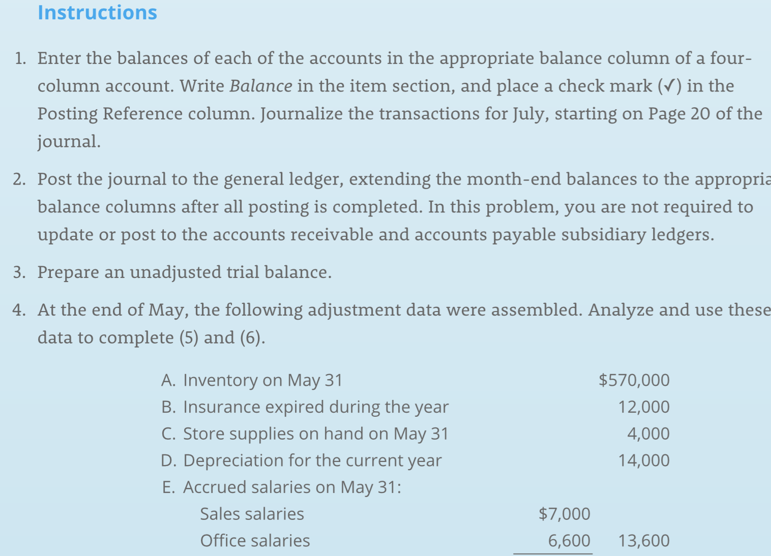 Step 4: Prepare the Trial Balance as of May 31 on a ten column work sheet listing all accounts, in order, from the general ledger accounts. Complete the work sheet using the adjusting entries shown on page 268 instruction # 4.
