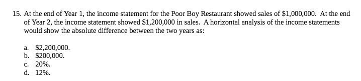 15. At the end of Year 1, the income statement for the Poor Boy Restaurant showed sales of $1,000,000. At the end of Year 2, the income statement showed $1,200,000 in sales. A horizontal analysis of the income statements would show the absolute difference between the two years as: a. $2,200,000. b. $200,000. c. 20%. d. 12%.Â