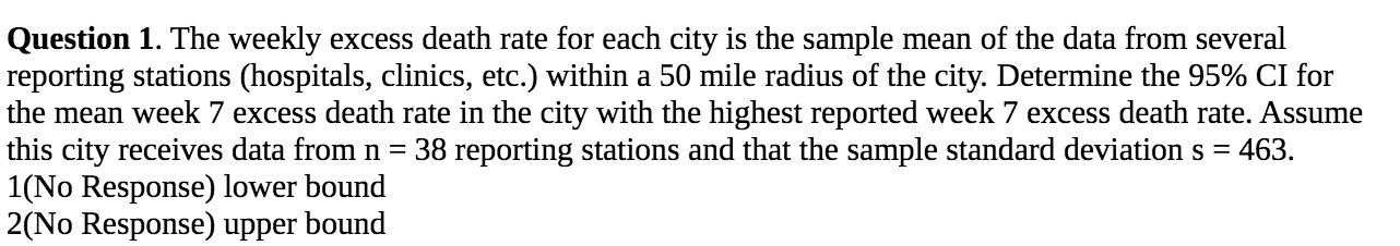 Question 1. The weekly excess death rate for each city is the sample mean of the data from several reporting stations (hospitals, clinics, etc.) within a 50 mile radius of the city. Determine the 95% CI for the mean week 7 excess death rate in the city with the highest reported week 7 excess death rate. Assume this city receives data from n = 38 reporting stations and that the sample standard deviation s = 463. 1(No Response) lower bound 2(No Response) upper boundÂ