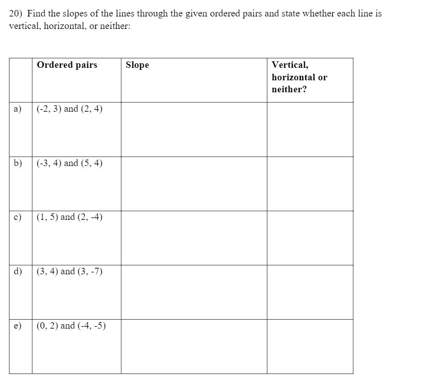 20) Find the slopes of the lines through the given ordered pairs and state whether each line is vertical, horizontal, or neither: Ordered pairs Slope Vertical, horizontal or neither? a) (-2, 3) and (2, 4) b) (-3, 4) and (5, 4) c) (l, 5) and (2, -4) d) (3, 4) and (3, -7) e) (0, 2) and (-4, -5)Â