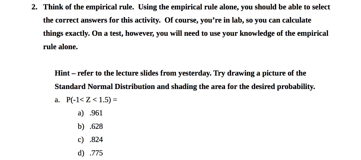 2. Think of the empirical rule. Using the empirical rule alone, you should be able to select the correct answers for this activity. Of course, you’re in lab, so you can calculate things exactly. On a test, however, you will need to use your knowledge of the empirical rule alone. Hint — refer to the lecture slides from yesterday. Try drawing a picture of the Standard Normal Distribution and shading the area for the desired probability. a. P(-1< Z < 1.5) = a) .961 b) .628 c) .824 d) .775Â