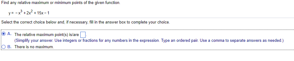 I need the relative maximum points and minium points in the from of (0,0) please. This is giving me a really hard time.