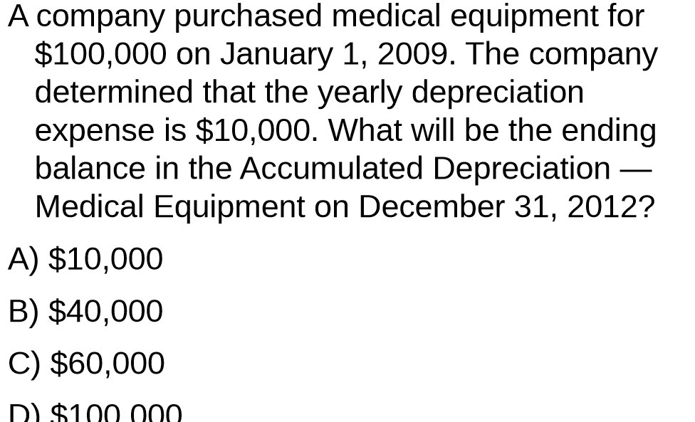 A company purchased medical equipment for $100,000 on January 1, 2009. The company determined that the yearly depreciation expense is $10,000. What will be the ending balance in the Accumulated Depreciation — Medical Equipment on December 31, 2012? A) $10,000 B) $40,000 o) $60,000 m $100 000Â