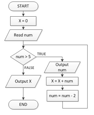 Question 5. 5. (TCOs 5 and 8) Write the pseudocode for the flowchart below, and list what the output will be if the input for num is 9.  (Points : 6) |