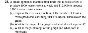 22. A small-appliance manufacturer finds that it costs $9000 to produce 1000 toaster ovens a week and $12,000 to produce 1500 toaster ovens a week. (a) Express the cost as a function of the number of toaster ovens produced, assuming that it is linear. Then sketch the graph. (b) What is the slope of the graph and what does it represent? (c) What is the y-intercept of the graph and what does it represent?