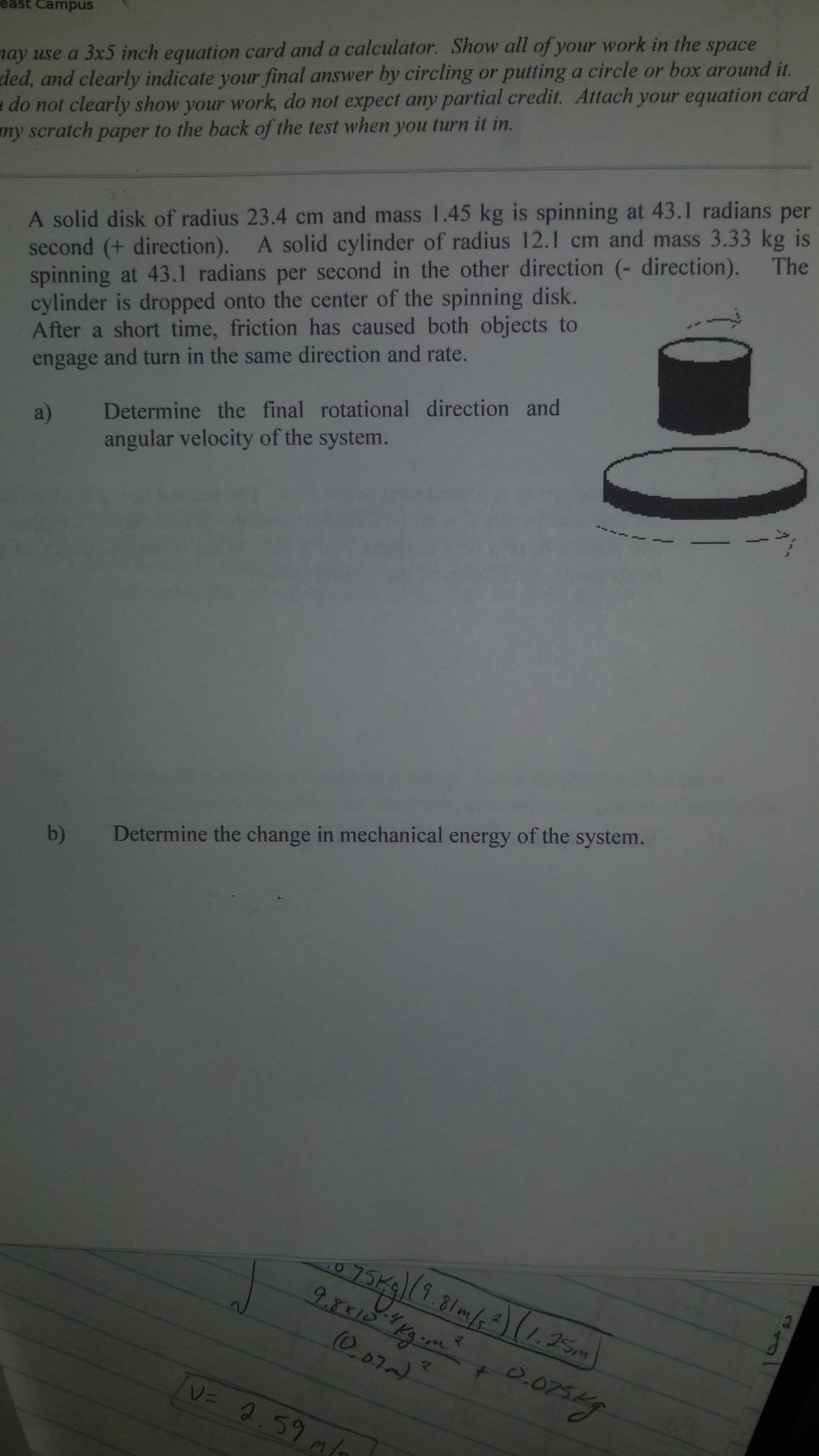 A solid disk of radius 23.4 cm and mass 1.45 kg is spinning at 43.1 radians per second (+ direction). A solid cylinder of radius 12.1 cm and mass 3.33 kg is spinning at 43.1 radians per second in the other direction (- direction). The cylinder is dropped into the center of the spinning disk. After a short time, friction has caused both objects to engage and turn in the same direction and rate. a) Determine the final rotational direction and angular velocity of the system. b) Determine the change in mechanical energy of the system.