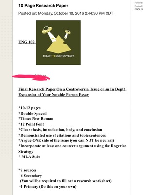 I need this English 102 research paper done. The topic and some of the sources are being provided. Along with that a basic outline is also being provided. The outline doesn't have to be completely followed. I am also giving the requirements for the paper. I NEED THE FIRST 2 PAGES DONE WITHIN THE FIRST 4 HOURS. AND NEED THE FIRST 4 PAGES DONE BY WEDNESDAY 11/9.
