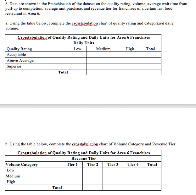 3. Data are shown in the Franchise tah ofthe dataset on the quality rating, volume, average wait time from