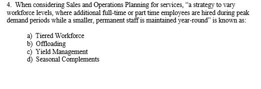 4. When considering Sales and Operations Planning for services, “a strategy to vary workforce levels, where additional full-time or part time employees are hired during peak demand periods while a smaller, permanent staff is maintained year-round” is known as: a) Tiered Workforce b) Offloading c) Yield Management (1) Seasonal Complements