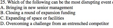 25. Which of the following can be the most disrupting event t A. Bringing in new senior management B. Closing a round of expansion funding C. Expanding of space or facilities D. Overcoming a challenge from an entrenched competitorÂ