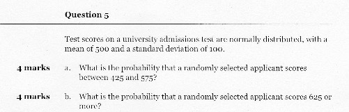 Question 5 Test scores on a university admissions test are normally distributed, with a mean of 500 and a standard den’ation of 100. 4 marks a. What is the probability that a randomly selected applicant scores between 425 and 575? 4 nlarks b. What is the probability that a randomly selected applicant scores 625 or more?Â