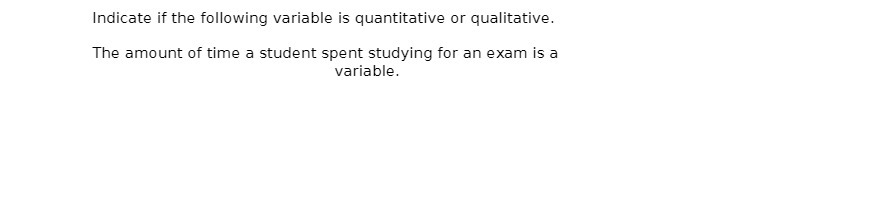 Indicate if the following variable is quantitative or qualitative. The amount of time a student spent studying for an exam is a variable.Â