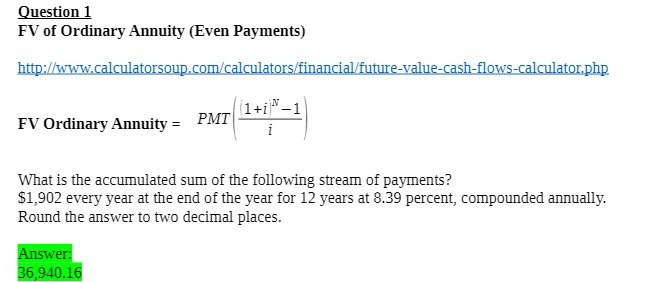Question 1 FV of Ordinary Annuity (Even Payments) httD://www.calculatorsoup.com/calculators/financial/future-Value-cash-flows-calculator.DhD FV Ordinary Annuity = P M l What is the accumulated sum of the following stream of payments? $1,902 every year at the end of the year for 12 years at 8.39 percent, compounded annually. Round the answer to two decimal places.Â