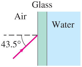 An aquarium filled with water (n = 1.33) has flat glass sides whose index of refraction is 1.52. A beam of light from outside the aquarium strikes the glass at a 43.5 ∘ angle to the perpendicular (Figure 1) .