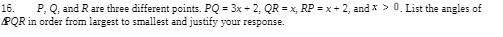 16. P, Q, and R are three different points. PQ = 3x + 2, QR = x, RP = x + 2, and I 3‘ '3. List the angles of ZPQR in order from largest to smallest and justify your response.Â