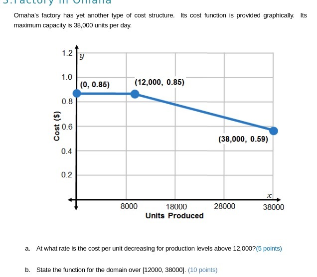 J.FOLLUly III UIIIGIIG Omaha’s factory has yet another type of cost structure. Its cost function is provided graphically. Its maximum capacity is 38,000 units per day. It 1-2 y 1-0 In! [1.35] [12,“, [1.85] 03 E ‘5; 0 0 0 0 [33,000, 0.59] 0-4 0-2 a I I. 7 3000 13000 23000 33mg Units Produced a. At what rate is the cost per unit decreasing for production levels above 12,000?(5 points) b. State the function for the domain over [12000, 38000]. (10 points)Â