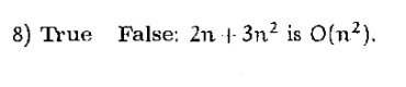 8) True False: 2n+ 3n2 is 0(n2).Â