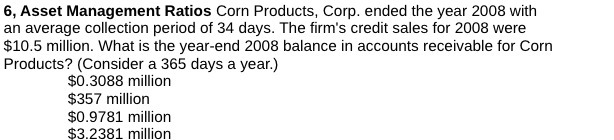 6, Asset Management Ratios Corn Products, Corp. ended the year 2008 with an average collection period of 34 days. The firm's credit sales for 2008 were $10.5 million. What is the year-end 2008 balance in accounts receivable for Corn Products? (Consider a 365 days a year.) $0.3088 million $357 million $0.9781 million $3.2381 millionÂ