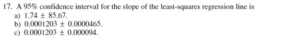 17. A 95% confidence interval for the slope of the least-squares regression line is a) 1.74 i 85.67. b) 0.0001203 i 0.0000465. c) 0.0001203 i 0.000094.