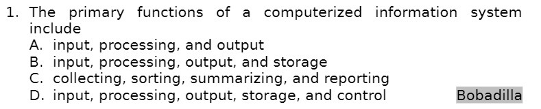 1. The primary functions of a computerized information system include A. input, processing, and output B. input, processing, output, and storage C. collecting, sorting, summarizing, and reporting D. input, processing, output, storage, and control BobadillaÂ