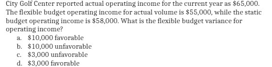 City Golf Center reported actual operating income for the current year as $65,000. The flexible budget operating income for actual volume is $55,000, while the static budget operating income is $58,000. What is the flexible budget variance for operating income? a. $ 10,000 favorable b. $ 10,000 unfavorable c. $3,000 unfavorable d. $3,000 favorableÂ