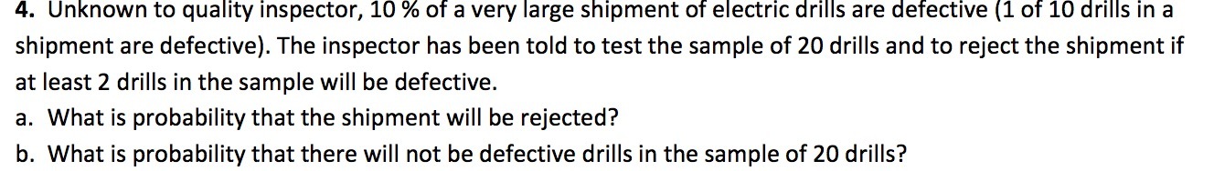 4. Unknown to quality inspector, 10 % of a very large shipment of electric drills are defective (1 of 10 drills in a shipment are defective). The inspector has been told to test the sample of 20 drills and to reject the shipment if at least 2 drills in the sample will be defective. a. What is probability that the shipment will be rejected? b. What is probability that there will not be defective drills in the sample of 20 drills?Â