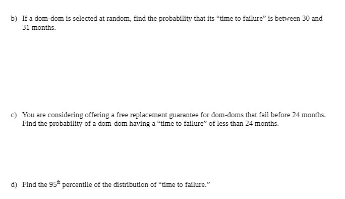 b) If a dom-dom is selected at random, find the probability that its “time to failure” is between 30 and 31 months. c) You are considering offering a free replacement guarantee for dom-doms that fail before 24 months. Find the probability of a dom-dom having a “time to failure” of less than 24 months. d) Find the 95th percentile of the distribution of “time to failure.”