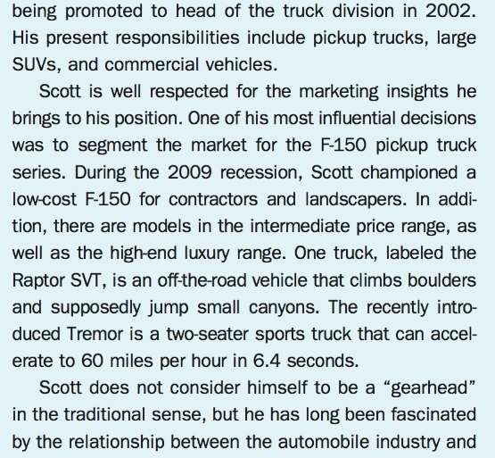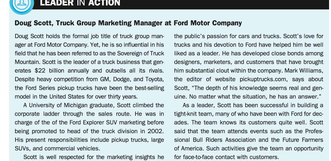 Read the Leader in Action, “Doug Scott, Truck Group Marketing Manager at Ford Motor Company” on p. 258 of your textbook. Then, respond to the following: