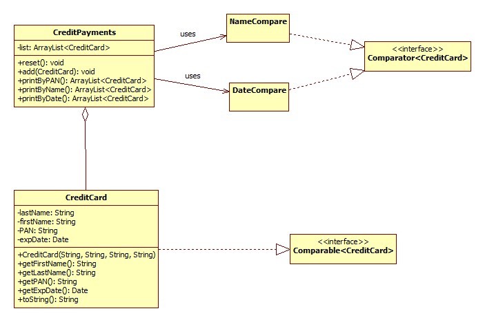 CreditPayments. This class will serve as a container for credit cards and will be used to print the cards in different order.