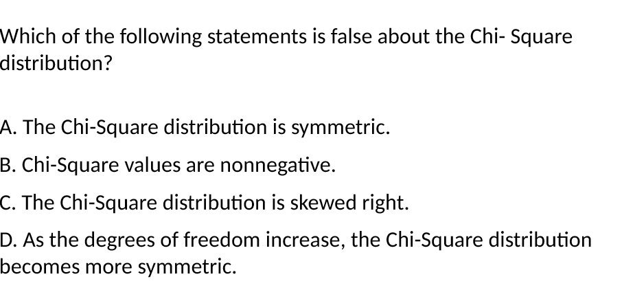 Which of the following statements is false about the Chi- Square distribution? A. The Chi-Square distribution is symmetric. B. Chi-Square values are nonnegative. C. The Chi-Square distribution is skewed right. D. As the degrees of freedom increase, the Chi-Square distribution becomes more symmetric.Â