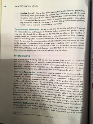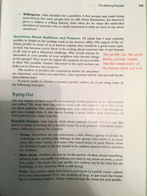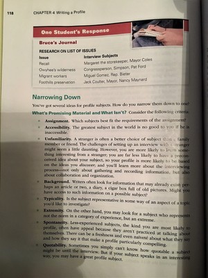 Use the brainstorming activities outlined on pages 116-120 to generate a topic for your profile. Ideally, I'd like you to post your work directly to your journal. But if you prefer to brainstorm in a notebook, then after each brainstorming exercise, post a 50-100 word reflection on what you generated. Let me know what most surprised you, what was difficult, what ideas you liked best/least.