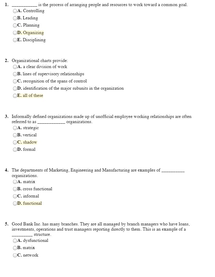 1. is the process of arranging people and resources to work toward a common goal. A. Controlling B. Leading C. Planning E. Disciplining 2. Organizational charts provide: A. a clear division of work B. lines of supervisory relationships C. recognition of the spans of control D. identification of the major subunits in the organization 3. Informally defined organizations made up of unofficial employee working relationships are often referred to as organizations. A. strategic B. vertical D. formal 4. The departments of Marketing, Engineering and Manufacturing are examples of organizations. A. matrix B. cross functional C. informal 5. Good Bank Inc. has many branches. They are all managed by branch managers who have loans, investments, operations and trust managers reporting directly to them. This is an example of a structure. A. dysfunctional B. matrix C. network