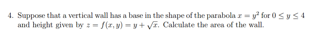 Suppose that a vertical wall has a base in the shape of the parabola x = y 2 for 0 ≤ y ≤ 4 and height given by z = f(x, y) = y + √ x. Calculate the area of the wall.