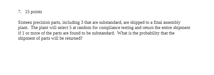 7. 15 points Sixteen precision parts, including 3 that are substandard, are shipped to a final assembly plant. The plant will select 5 at random for compliance testing and return the entire shipment if 1 or more of the parts are found to be substandard. What is the probability that the shipment of parts will be returned?Â
