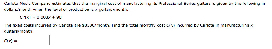The fixed costs incurred by Carlota are $8500/month. Find the total monthly cost C(x) incurred by Carlota in manufacturing x guitars/month.