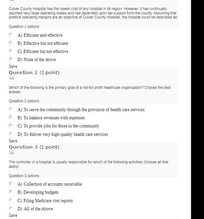 Culver County Hospital has the lowest cost of any hospital in its region. However, it has continually reported very large operating losses and has depended upon tax support from the county. Assuming that positive operating margins are an objective of Culver County Hospital, the hospital could be described as: Question 1 options: F A) Efficient and effective F B) Effective but not efficient r'“ C) Efficient but not effective F D) None of the above Save Question 2 (1 point) Which of the following is the primary goal of a not-for-profit healthcare organization? Choose the best answer. Question 2 options: r'“ A) To serve the community through the provision of health care services F B) To balance revenues with expenses F C) To provide jobs for those in the community F D) To deliver very high-quality health care services Save Question 3 (1 point) The controller in a hospital is usually responsible for which of the following activities (choose all that aPPIY)1 Question 3 options: F A) Collection of accounts receivable F B) Developing budgets F C) Filing Medicare cost reports F D) All of the Above SaveÂ