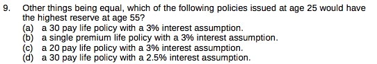 9. Other things being equal, which of the following policies issued at age 25 would have the highest reserve at age 55? (a) a 30 pay life policy with a 3% interest assumption. (b) a single premium life policy with a 3% interest assumption. (c) a 20 pay life policy with a 3% interest assumption. (d) a 30 pay life policy with a 2.5% interest assumption.Â
