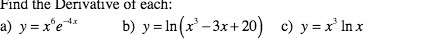 '1nd the Denvatlve or each: a) y: x6e 4" b)y=1n(x3—3x+20) c)y=x31nxÂ