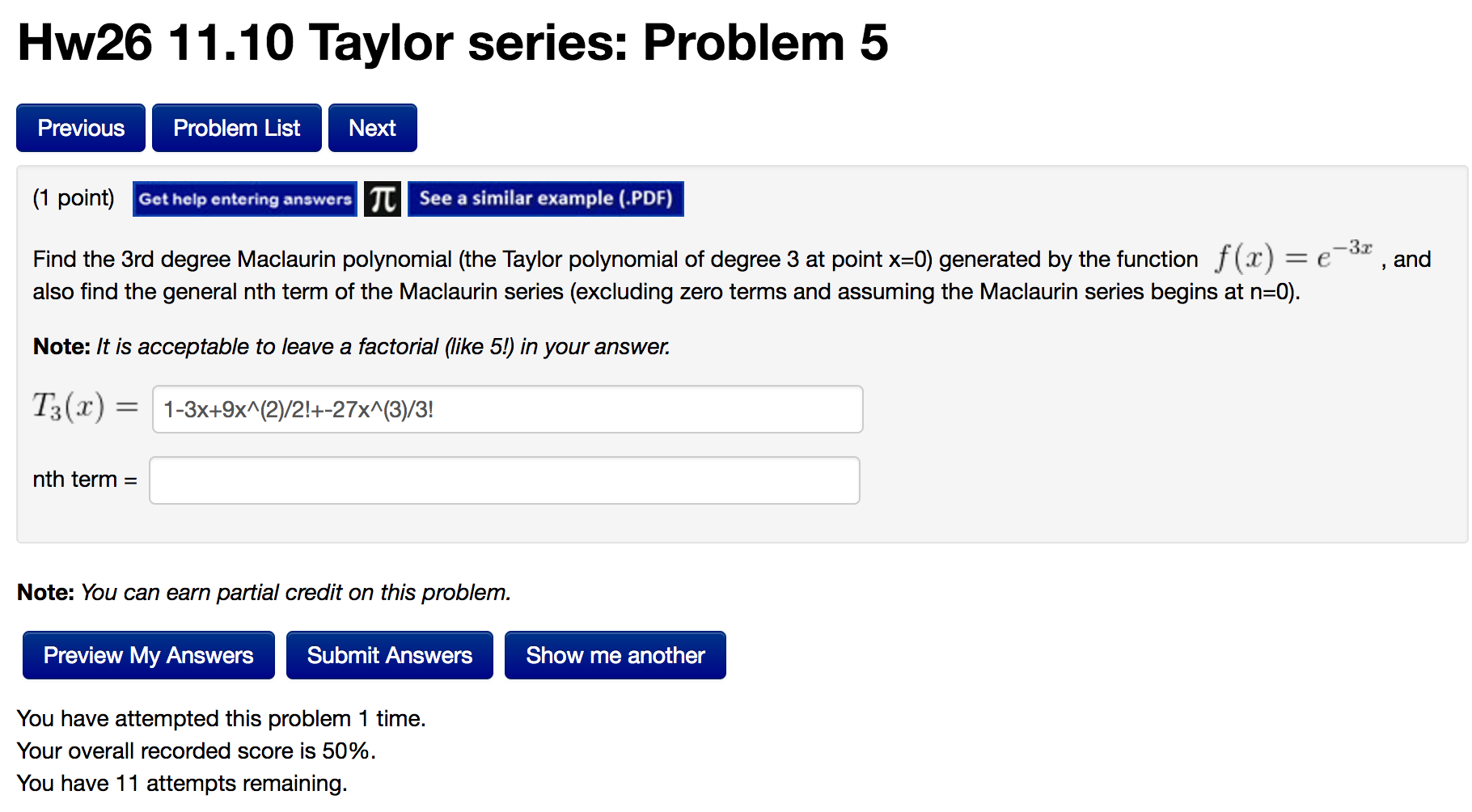 also find the general nth term of the Maclaurin series (exchding zero terms and assuming the Maclaurin series begins at n=0). 3:”,and Note: It is acceptable to leave a factorial (like 5!) in your answer: T3(a:) = 1-3x+9x’\(2)/2!+—27x’\(3)/3! nth term = Note: You can earn partial credit on this problem. Preview My Answers Submit Answers Show me another You have attempted this problem 1 time.