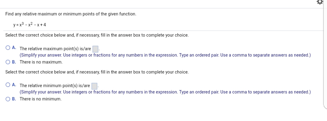 0 A- The relative minimum point(s) isI are E. (Simplify your answer. Use integers or fractions for any numbers in the expression. Type an ordered pair. Use a comma to separate answers as needed.)