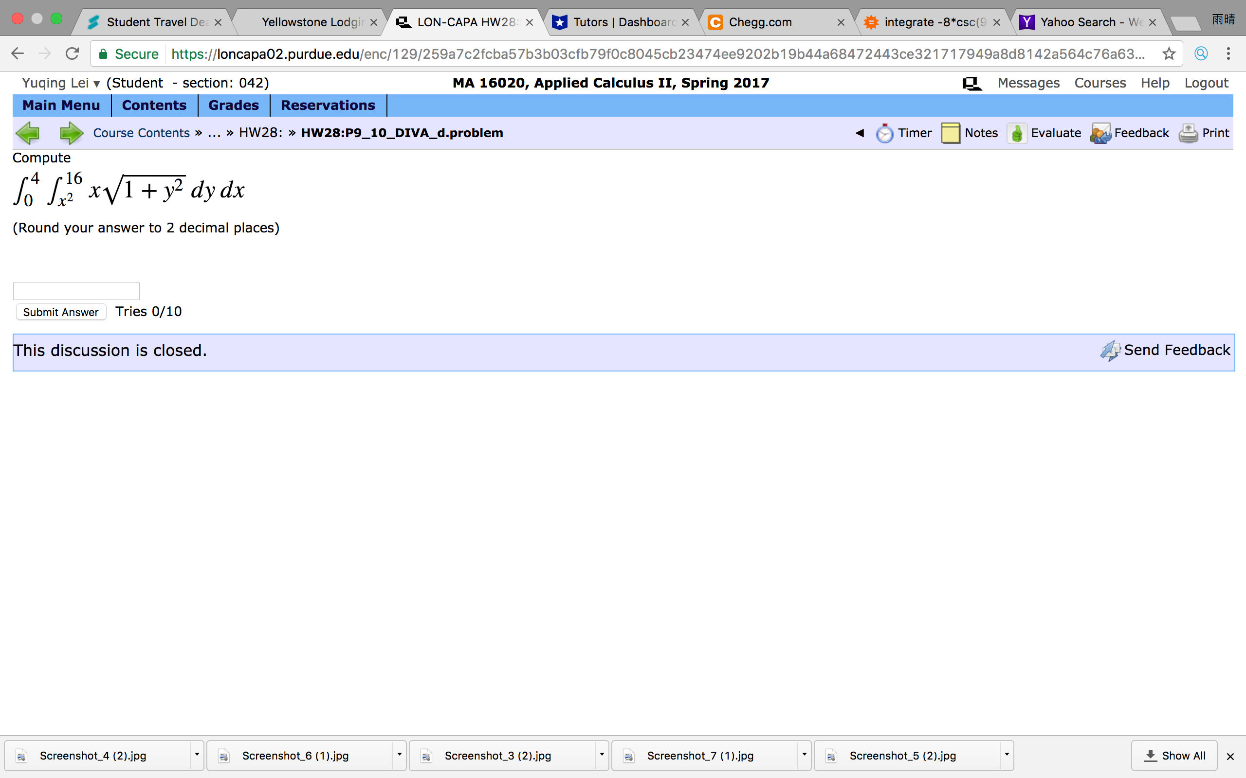 a LON-CAPA HW281 X 6 9 C‘ ‘0 Secure httpszllloncapaOZ.purdue.edu/enc/129/259a7c2fcba57b3b03cfb79f0c8045cb23474ee9202b19b44a68472443ce321717949a8d8142a564c76a63... fi‘ @ 5 Yuqing Lei v (Student - section: 042) MA 16020, Applied Calculus 1!, Spring 2017 Q Messages Courses Help Logout
